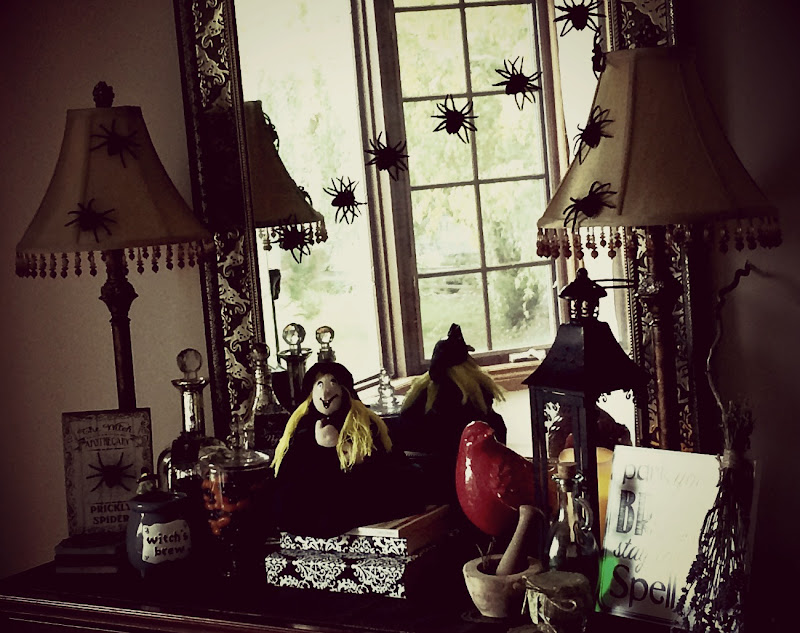 I found this "Park your broom, stay for a spell" wall art at HomeSense, raided my kitchen for a mortar and pestle and a couple of condiment bottles, add a glass of orange and black jelly beans and some plastic spiders and there you go .... my Halloween witch's potion table.